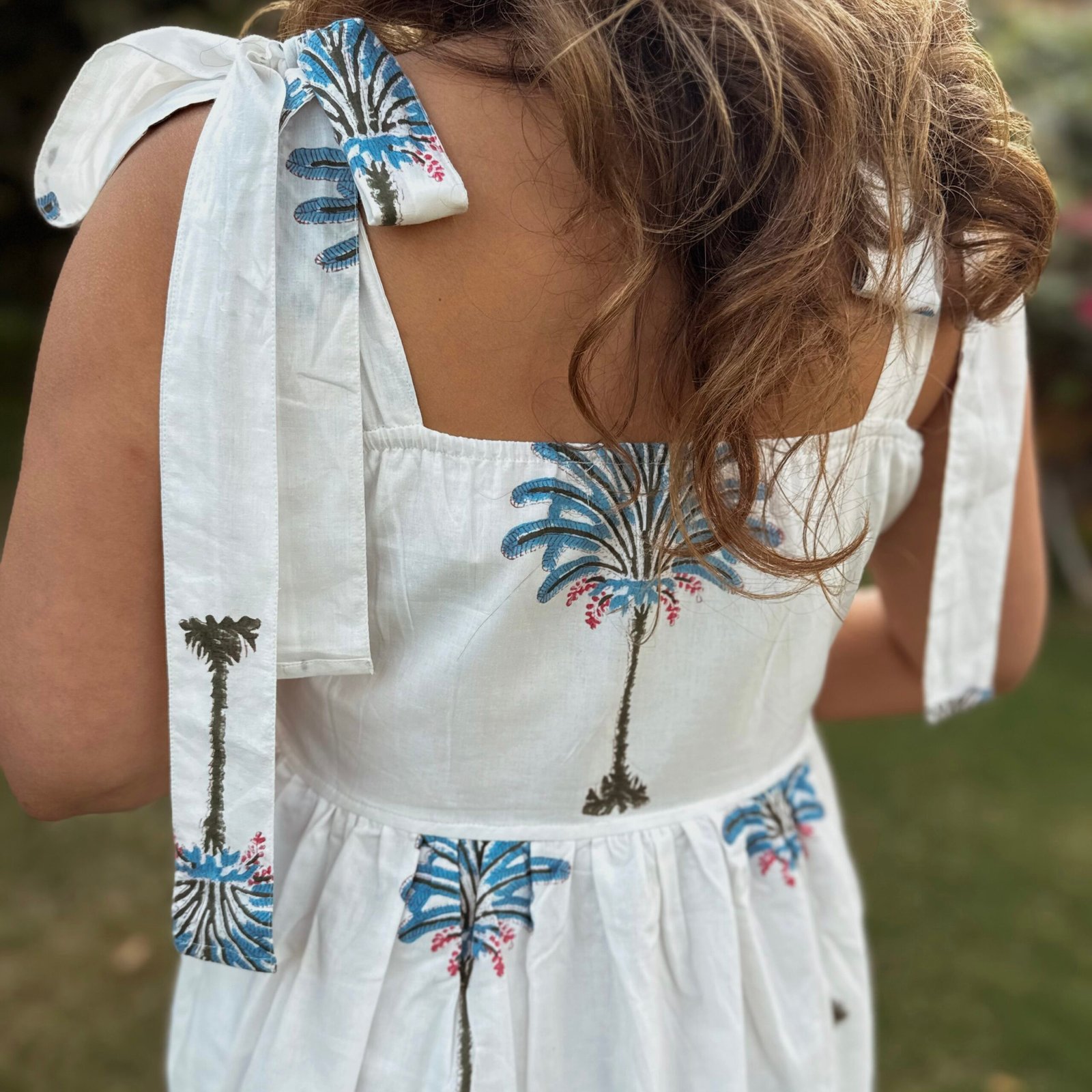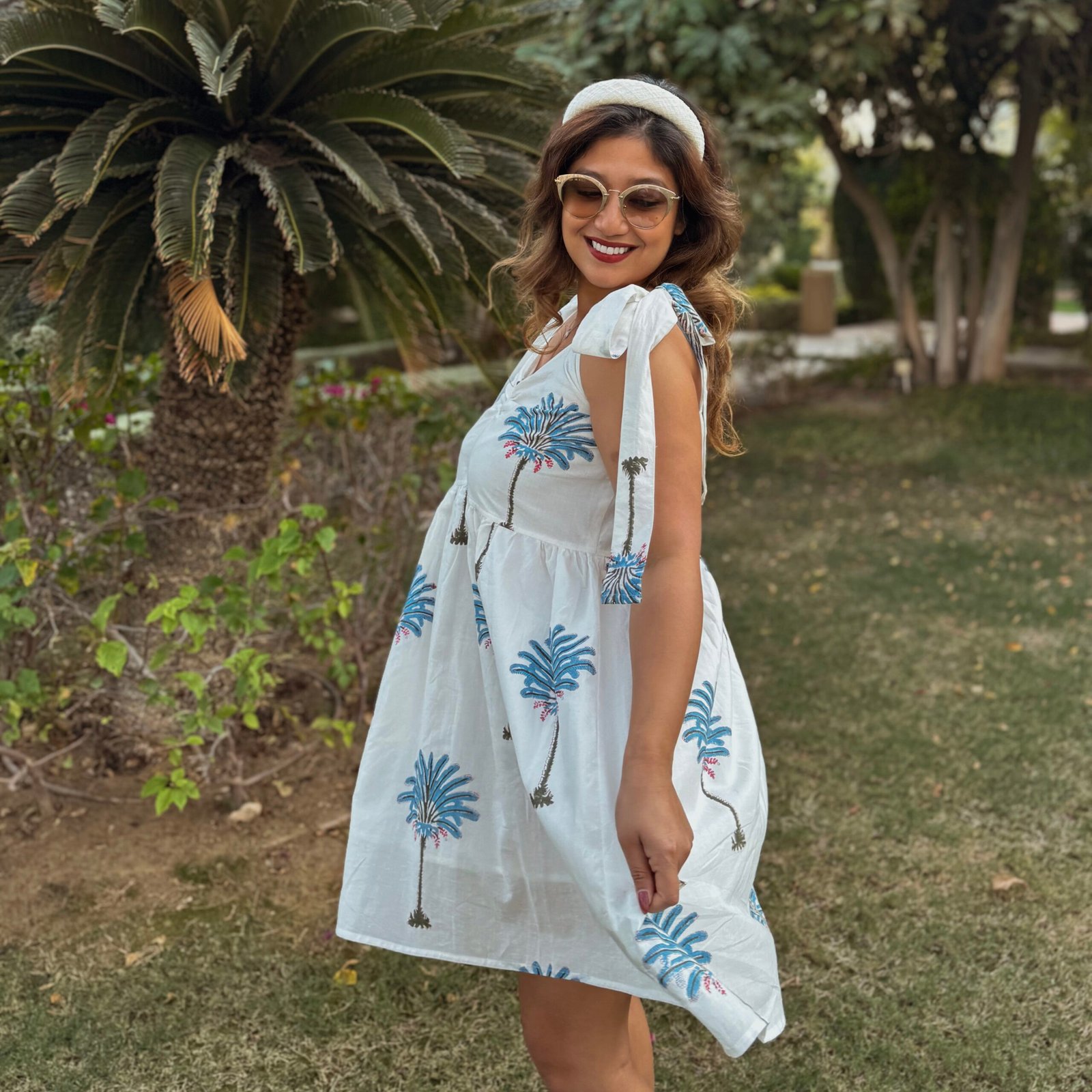 Let your inner island girl shine in the Palm Mini, made to be oversized. Hand Block Printed with whimsical blue palms and tied with sweet shoulder bows. This dress is made for golden hour strolls, barefoot twirls, and spontaneous adventures. The easy, swingy fit keeps things carefree, while the artisan detail adds one-of-a-kind magic.