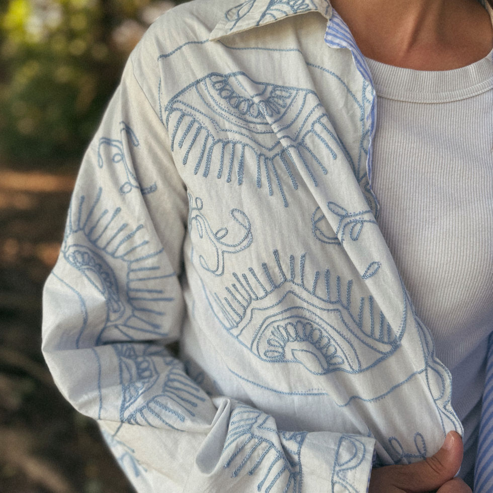 The "one-eye" symbol is known worldwide as a representation of intelligence, wisdom, and enlightenment. A genius design for outerwear! Its light weight yet cozy feel will keep you regulated in most mid-range temperatures. Adding this hand embroidered jacket to your wardrobe collection would be super smart!